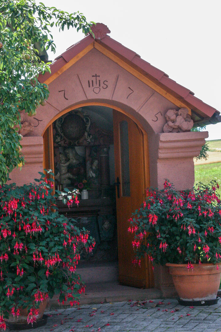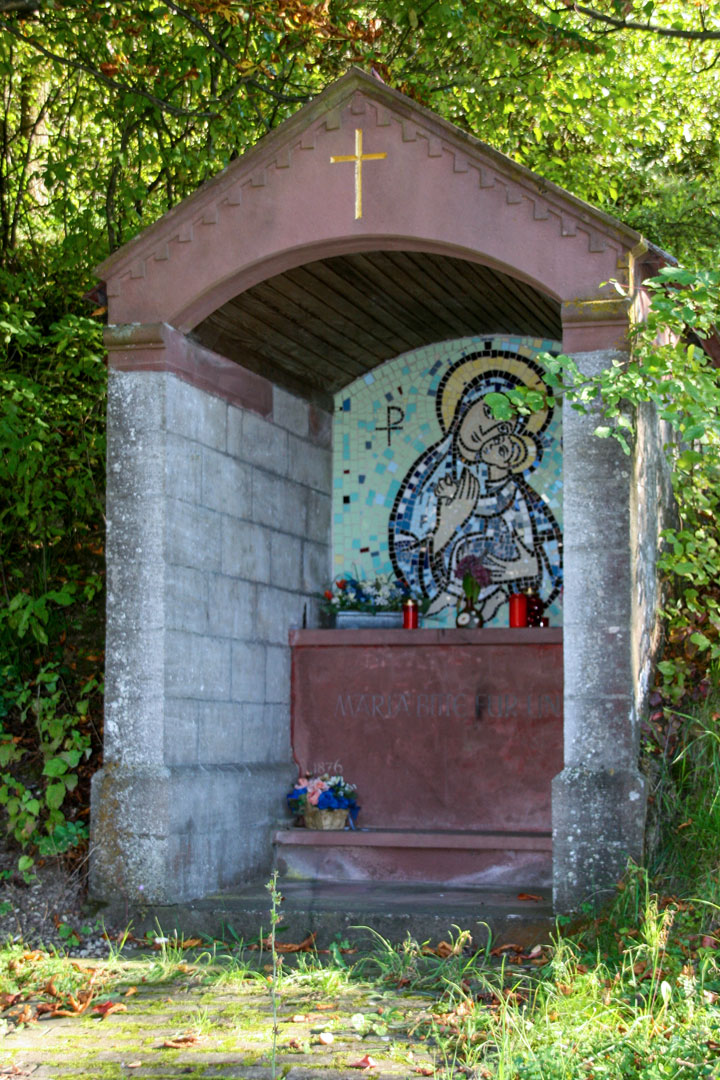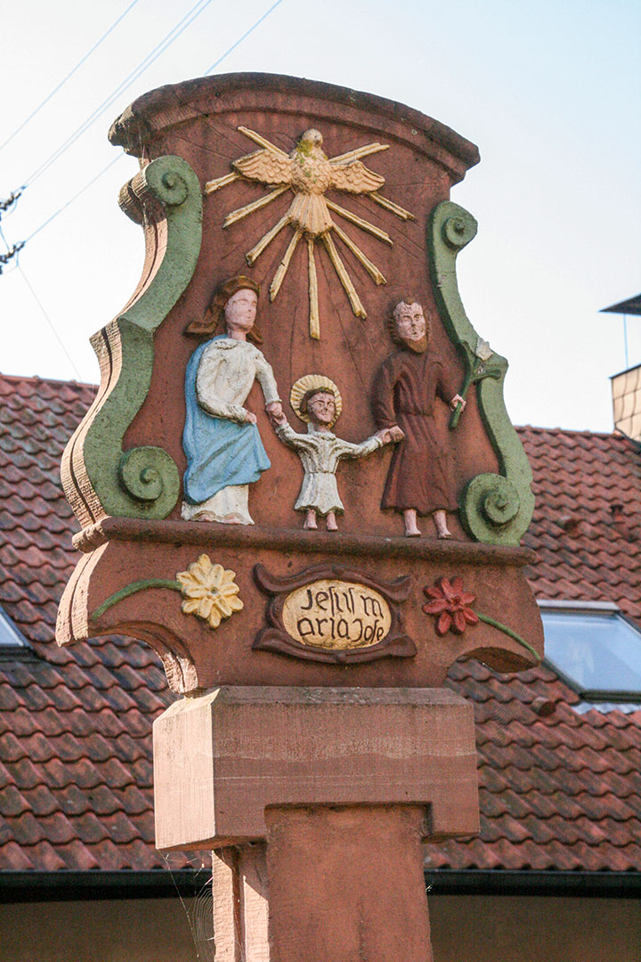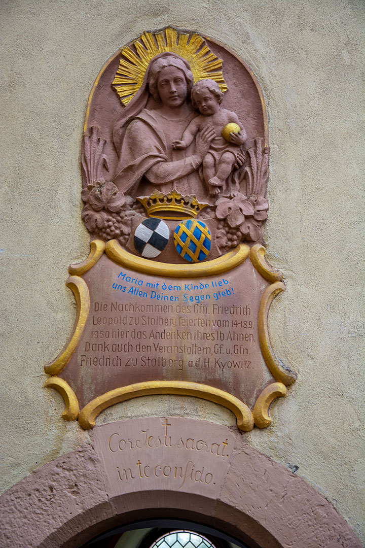 Vor allem an exponierter Stelle können Relieftafeln beiderseits Bildmovtive präsentieren. Häufig ist eines davon die Darstellung eines Gnadenbildes.
